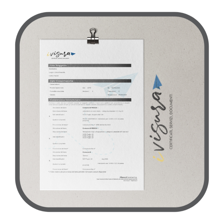 Il servizio online di visura ipocatastale completa fornisce un documento che permette di conoscere la consistenza immobiliare attualmente in carico ad un soggetto. La visura, infatti, riporta una relazione dettagliataย (basata sul documento di visura ipotecaria o ipocatastale) sui beni immobili posseduti da un soggetto e gli eventuali gravami relativi agli stessi, sia di natura volontaria (es. ipoteche volontarie, costituzioni di fondi patrimoniali, etc.) sia di natura pregiudizievole (ipoteche giudiziarie, pignoramenti, sequestri), registrati presso una specificaย Conservatoria dei Registri Immobiliari.